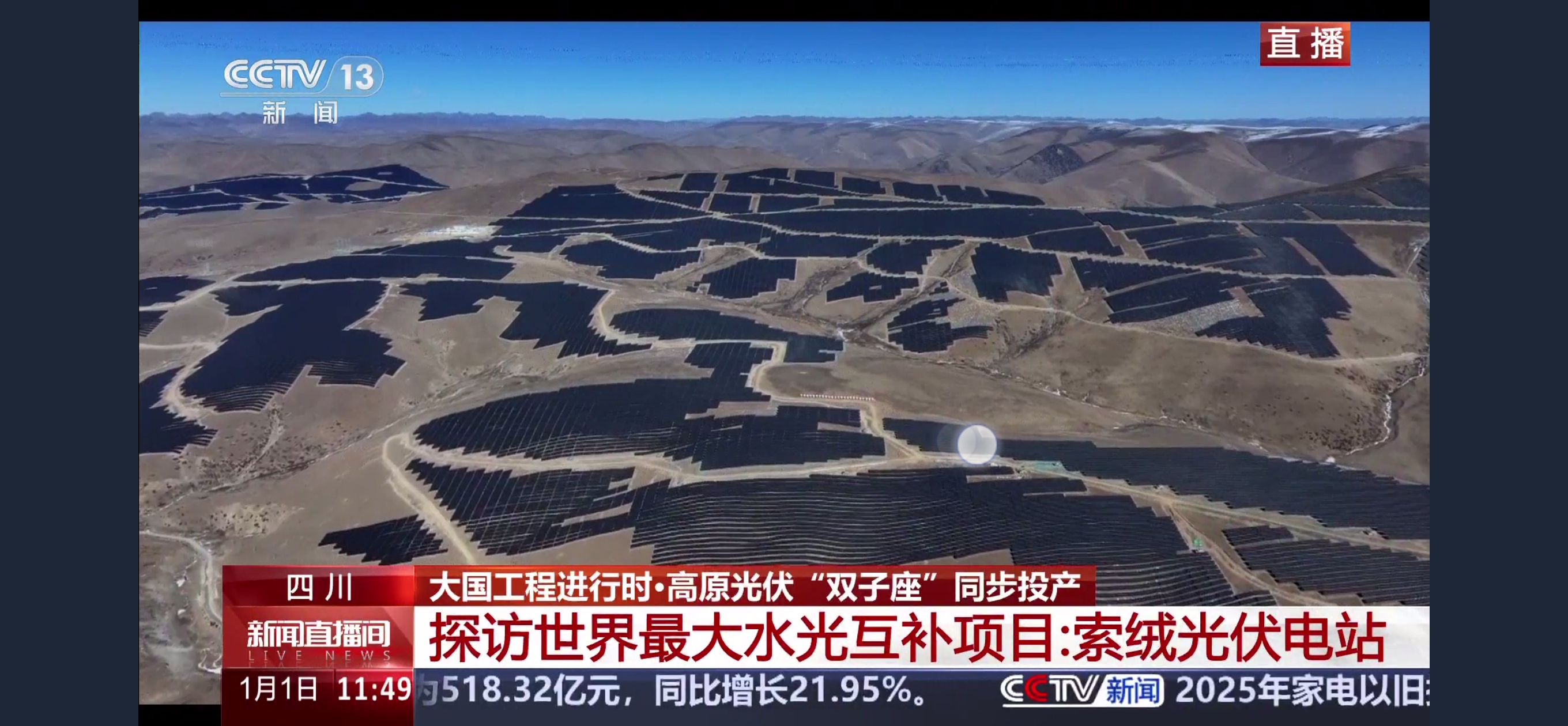 近日,四川省甘孜藏族自治州理塘縣索絨光伏項目并網發電,央視新聞兩度進行報道。 12月31日,央視新聞《朝聞天下》報道雅礱江索絨光伏電站、茶布朗光伏電站兩座百萬千瓦光伏項目同步投產發電。1月1日,央視新聞頻道《新聞直播間》“大國工程進行時”欄目跨年直播。央視新聞記者探訪索絨光伏項目現場,用5分鐘專題片再次對該項目進行報道。 索絨光伏項目位于海拔高程4100至4700米的高原,裝機容量1000兆瓦,是理塘縣首個百萬千瓦級可再生能源項目。項目共308個光伏方陣,光伏場區占地約2.1萬畝。建設過程中,累計為當地提供就業崗位超過1000個,有效拉動了理塘縣的經濟增長。索絨光伏全部投產后,每年可節約標準煤約59萬噸,減少二氧化碳排放約163萬噸。本次首批并網容量280兆瓦。 項目所發電量被輸送至鄰近的兩河口水電站,與水電打捆送出,通過水光互補、聯合調度的創新模式,有效平滑光伏發電的波動性,顯著提升區域電網的整體運行效率和清潔能源的穩定消納能力,對推動綠色低碳轉型,助力鄉村振興與“雙碳”目標落實,有效帶動理塘縣經濟增長與民生改善具有顯著作用。 |